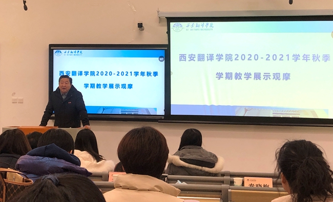 为深入贯彻落实全国教育大会精神,推进教育信息化,提高我校“双一流”建设水平,推进五大“金课”建设和信息化教学,充分发挥智慧教室在课堂教学改革中的作用,探索实施智能化的精准教育,有效开展信息化课程教学改革,2021年1月6日上午,西安翻译学院开展2020-2021学年秋季学期教学展示观摩活动。副校长兼教务长齐玉水、教务处处长秦晓梅等领导出席观摩活动并讲话。各二级学院(部)分管教学工作的院长、教学管理人员及全体专职教师(含校内兼职教师)参加。活动由教务处处长秦晓梅主持。