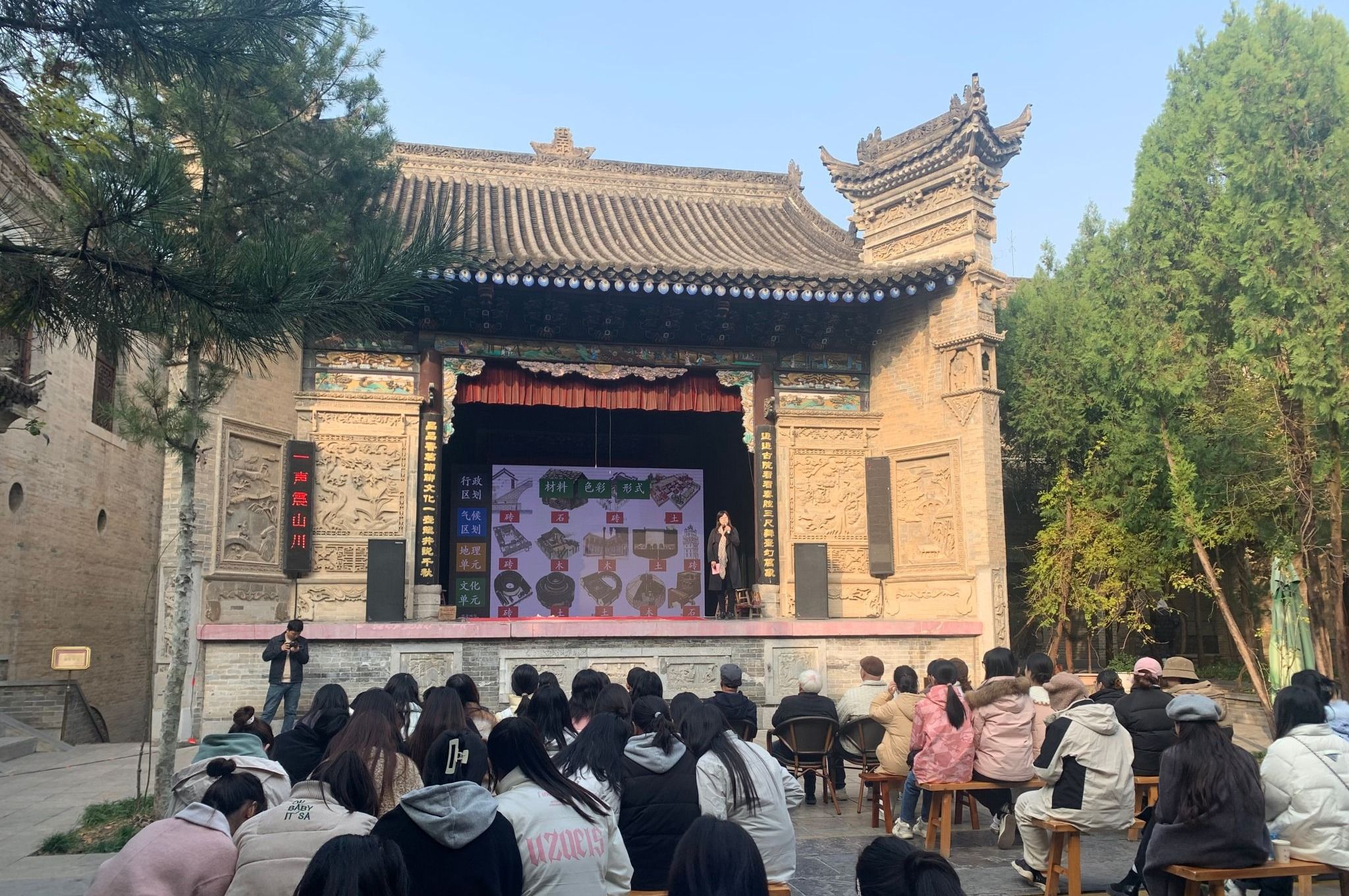 接着,同学们在梨园参加了西安市文物局、西安市文化和旅游局、西安建筑科技大学、关中民俗艺术博物院组织的“文物会说话系列大讲堂---民居物语”的讲座,由西安建筑科技大学博士生导师靳亦冰教授主讲。靳教授从文物与民居、诗词中的建筑、民居艺术建筑特征解读、非遗与民居四个方面展开了讲述。她介绍了我国传统民居类型及特点,如北京四合院的韵味十足,福建土楼的奇特造型,甘肃的下沉性窑洞和陕北窑洞的建筑特色,以及其与当地自然环境、人文历史的紧密联系。她讲述了民居中的建筑构件与装饰艺术,分析其制作工艺、艺术风格及所蕴含的文化寓意,展现古人的审美情趣和精湛技艺。靳教授还分析了民居建筑所见证的历史事件、家族变迁等,体现民居在传承历史文化方面的重要价值。