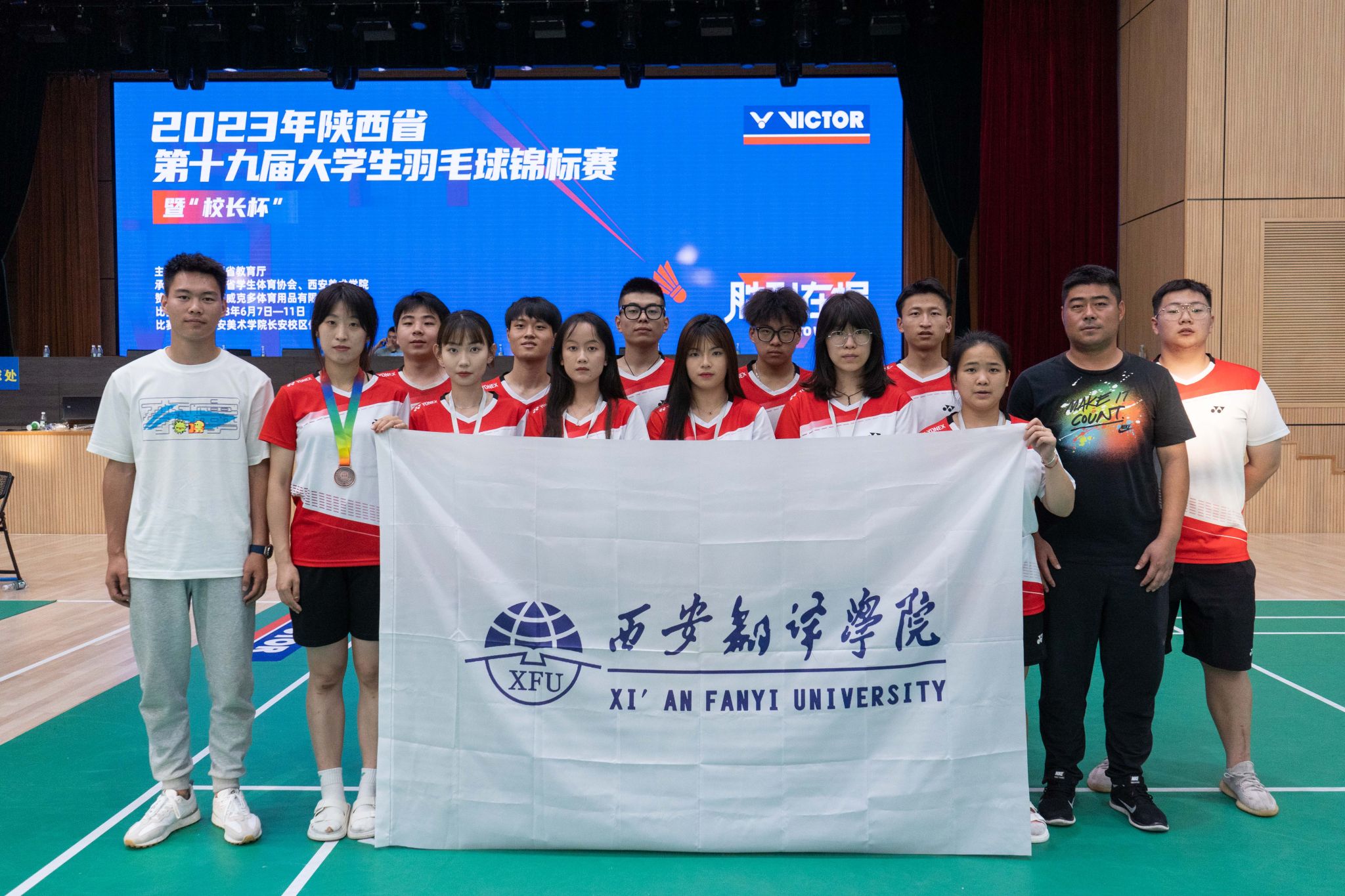 近日,由陕西省教育厅主办,陕西省学生体育协会、西安美术学院承办的陕西省第十九届大学生羽毛球锦标赛暨“校长杯”比赛在西安美术学院举办。西译代表队共派出12名队员参赛,由领队温博、教练员武陈老师带队。最终,我校喜获甲组女子团体第三名,选手贠心怡荣获甲组女子单打第三名,选手苗佳曦、朱孝孝荣获优秀运动员称号,武陈荣获优秀教练员称号。