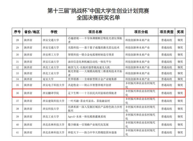 3月中旬,第十三届“挑战杯”中国大学生创业计划竞赛决赛在北京理工大学举行。西安翻译学院“足下生辉——十万农民共同富裕的领航者”项目斩获国家级铜奖。这也是我校第4年进入“挑战杯”国赛,我校也成为全省民办院校中唯一一所进入国赛的高校。