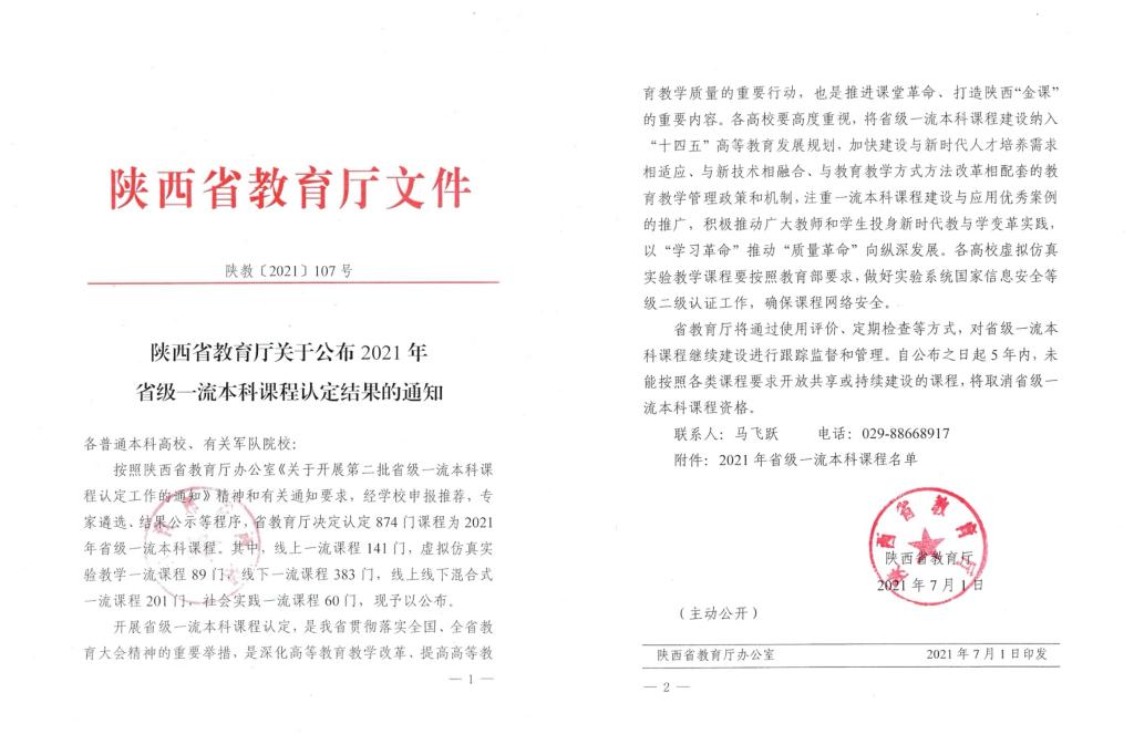 《关于对2021年度省级一流本科课程认定结果的通知》陕教〔2021〕107号