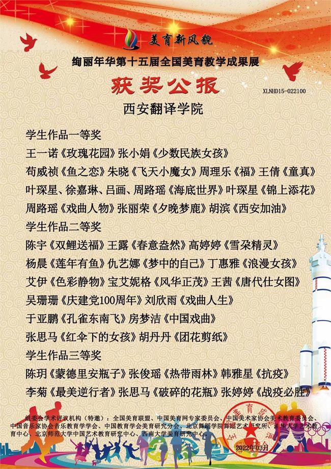 为贯彻落实习近平总书记关于美育的重要论述及全国教育大会精神,落实立德树人根本任务,弘扬中华美育精神,西安翻译学院组织师生积极参加“美育新风貌·绚丽年华”第十五届全国高校美育教学成果展。近日,从组委会传来捷报,西译师生在此次成果展中喜获佳绩。西安翻译学院荣获全国高校美育工作先进单位、全国高校美育教学优异成果奖、全国高校美育教学优秀组织奖、全国高校课程思政审美化教育教学奖。教师邵攀科荣获全国高校美育特殊贡献奖、美育课程思政教学先进工作者,邓超华荣获全国高校优秀组织教师奖、优秀指导教师奖、审美化能力一等奖。学生共有37件艺术作品获得荣誉,其中14个作品获得一等奖,17个作品获得二等奖,6个作品获得三等奖。