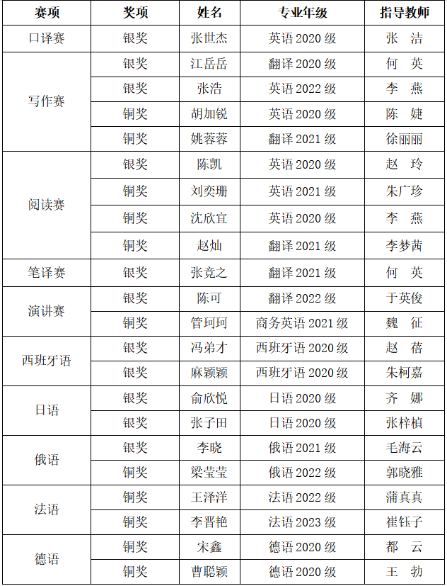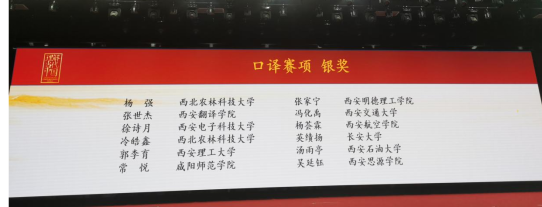 长风万里送秋雁。秋意正浓,赛事正酣。2023年10月15日-11月5日,2023“外研社·国才杯”“理解当代中国”全国大学生外语能力大赛陕西省省赛多语种赛道和英文赛道分别在线上及西安外国语大学长安校区顺利举行。我校选手与西安交通大学、西北工业大学、陕西师范大学、西安电子科技大学以及西安外国语学院等高校的百余名选手同场竞技,在各项赛事共获银奖11项、铜奖11项好成绩,多项赛事中取得优异成绩。具体如下: